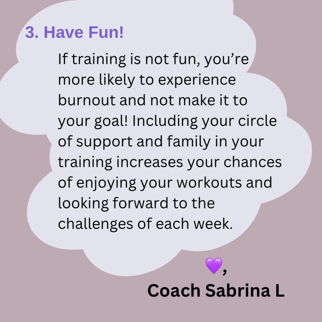 3. Have Fun! – If training is not fun, you’re more likely to experience burnout and not make it to your goal! Including your circle of support, and family, in your training increases your chances of enjoying your workouts and looking forward to the challenges of each week.